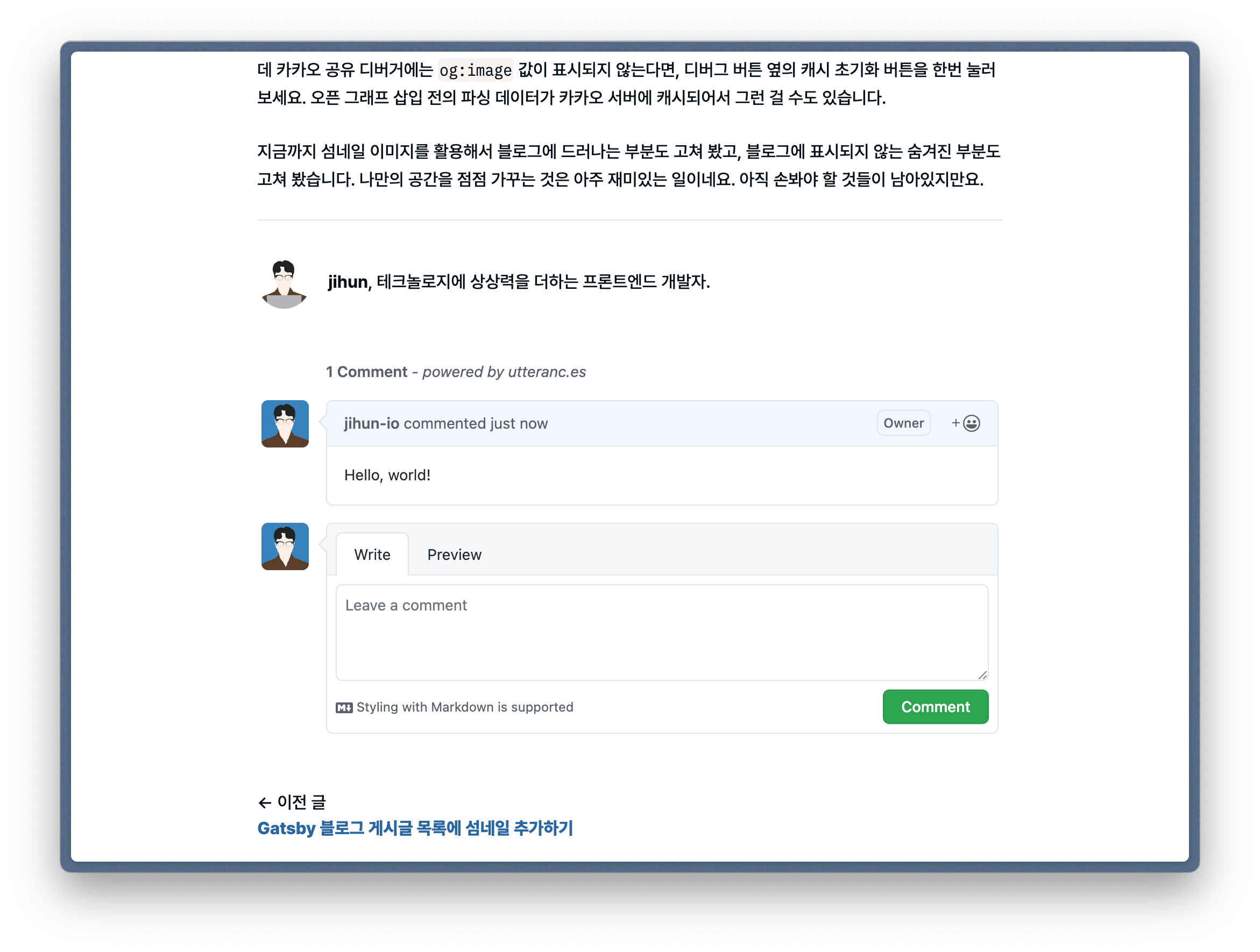 utterances가 제일 무난하고 적절할 것 같아서 블로그에 삽입해 봤습니다. 의도했던 댓글 기능이 잘 작동해서 만족했습니다만, 아쉬운 점이 있었습니다. 언어와 로캘이 영어라는 점입니다. 한국어 로캘을 적용할 수 있으면 그러고 싶은데, utterances에서는 이를 제공하지 않는 것 같았습니다. 또한, 일정 뷰포트 너비 미만의 모바일 환경에서는 프로필 이미지가 표시되지 않는다는 점도 다소 불편했습니다.