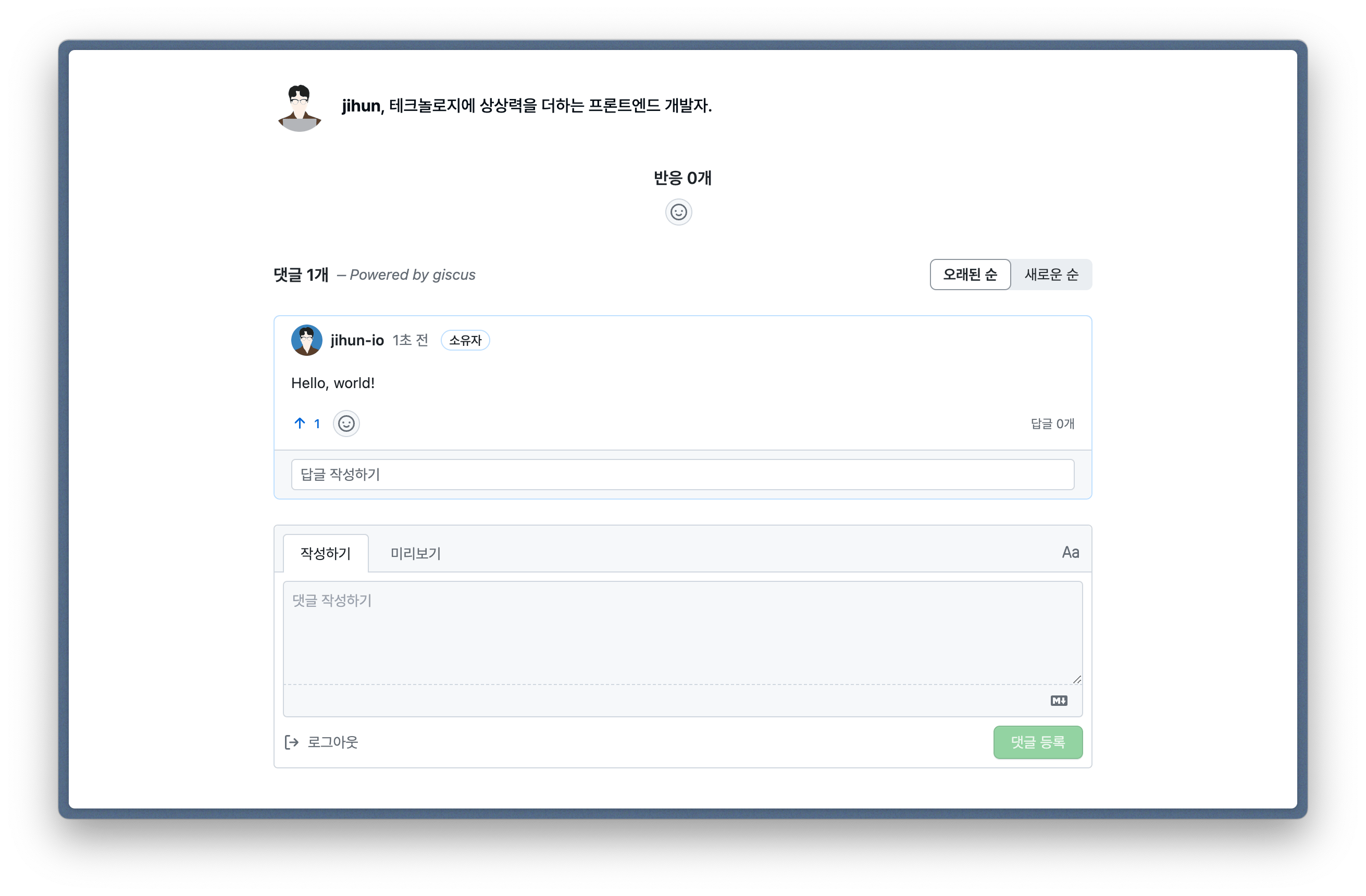 그래서 저는 utterances 대신 giscus를 선택했습니다. 공식 문서에도 utterances에서 큰 영감을 받았다고 언급되어 있는 걸 보면, giscus는 utterances의 완벽한 상위 호환이라고 생각이 듭니다.