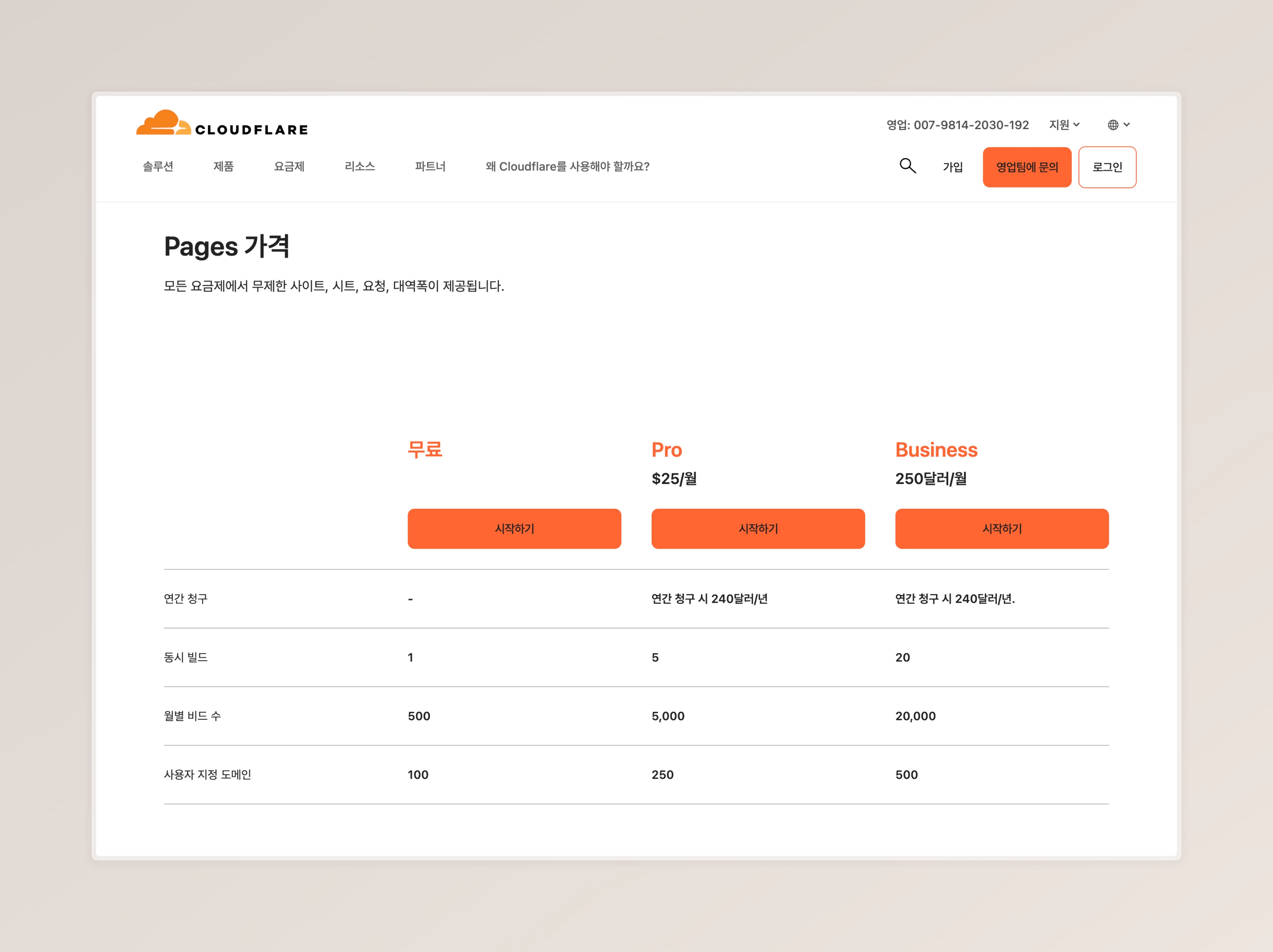 Cloudflare Pages는 무료입니다! Vercel과 Netlify에서도 무료 플랜을 제공하지만, 일정 트래픽 이상이 되면 과금이 되는 것으로 알고 있습니다. 반면에 Cloudflare Pages는 무료 플랜에서도 무제한 요청과 무제한 대역폭이 제공됩니다. 방문자 수를 쉽게 예측할 수 없는 이번 프로젝트의 경우 Cloudflare Pages를 선택하는 것이 가장 합리적이라고 생각했습니다.