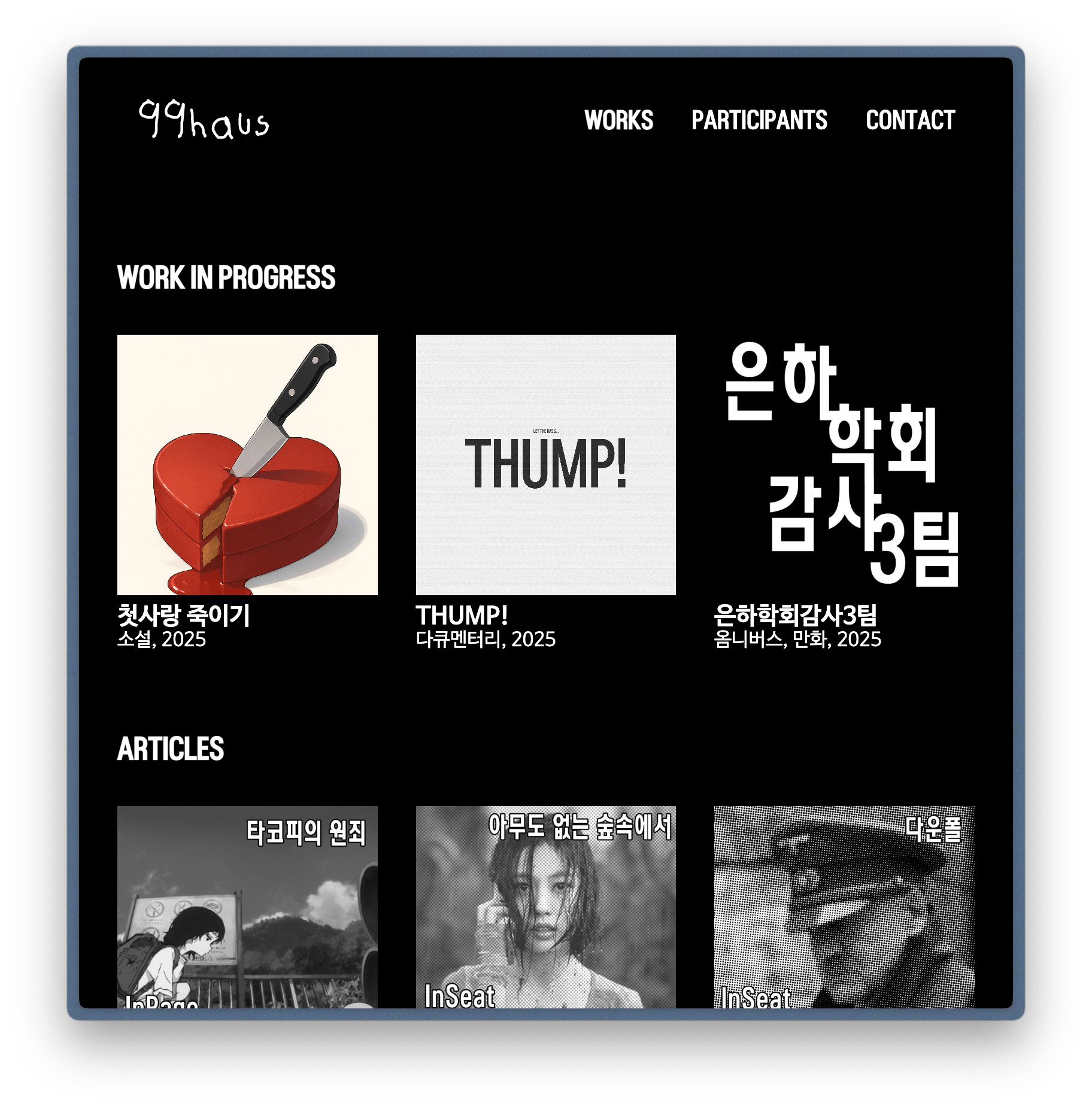 재밌는 프로젝트가 하나 더 생겼습니다. 작년에 ⟨혹성의 아이⟩ 영화를 제작했던 친구에게 자신의 포트폴리오 홈페이지를 만들어 달라는 요청을 받았습니다. 이름하여 ⟨99haus⟩('구구하우스'라고 읽음). 작업물과 아티클을 공유하는 것을 목표로 하는 이 페이지의 요구 사항은 단순했습니다. '글을 쓰면 누군가 찾아서 볼 수 있는 것.'