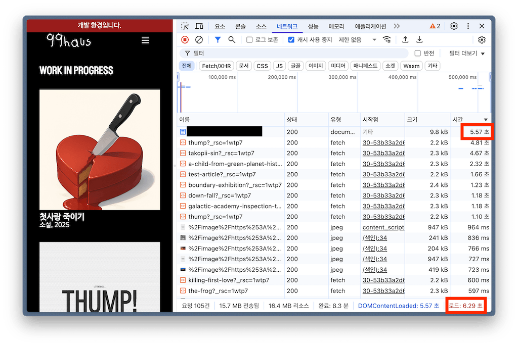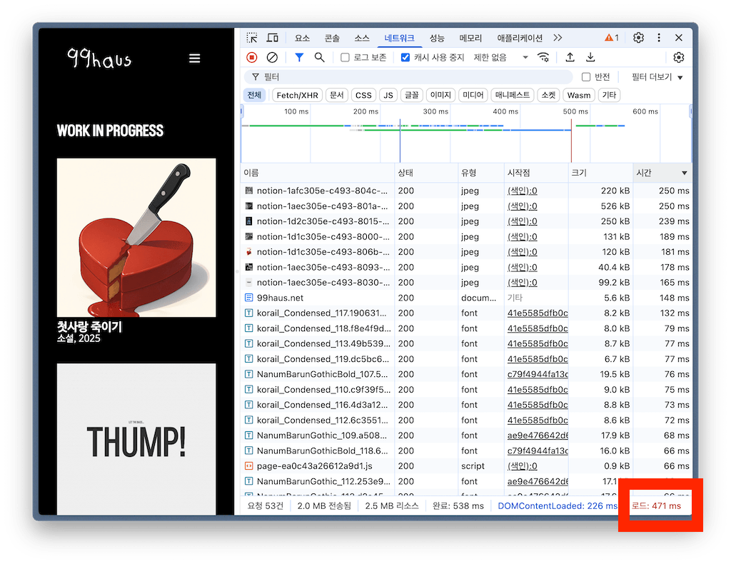 결과는 대성공이었습니다! 페이지 로드가 약 6초에서 약 0.4초로 대폭 줄었습니다. 대략 93.33% 감소한 셈이네요. 사실 기존의 로드 속도가 너무나도 터무니없는 수치였기 때문에 이런 기적적인 감소율이 나온 것이긴 합니다만, 어찌 됐든 로드 속도 문제를 해결할 수 있었으니 이걸로 된 거죠.